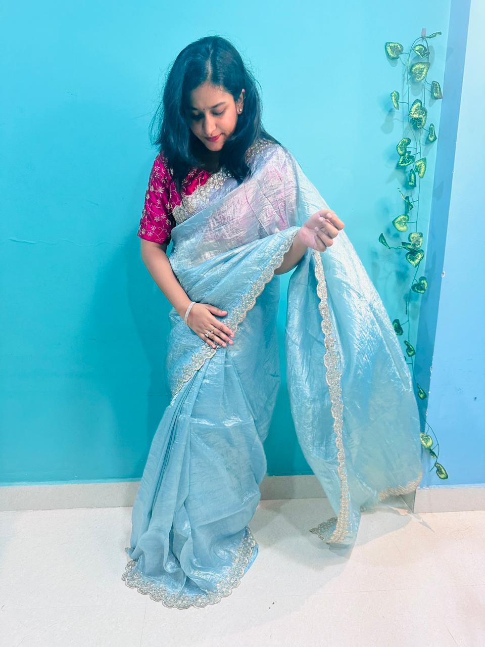This light blue crush silk tissue saree features an elegant border embroidery that enhances its delicate texture. Paired with a pink embroidered stitched blouse, it creates a striking color contrast that elevates your style. Ideal for those seeking a refined and sophisticated look, this combination balances traditional craftsmanship with contemporary appeal.