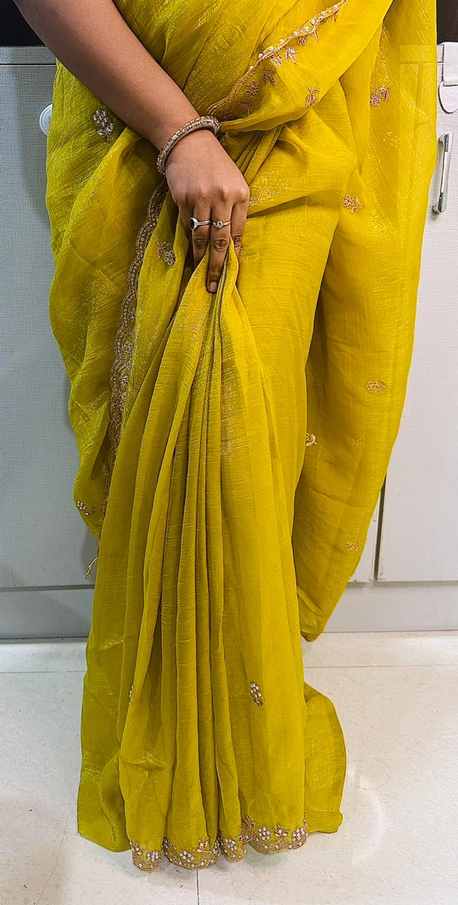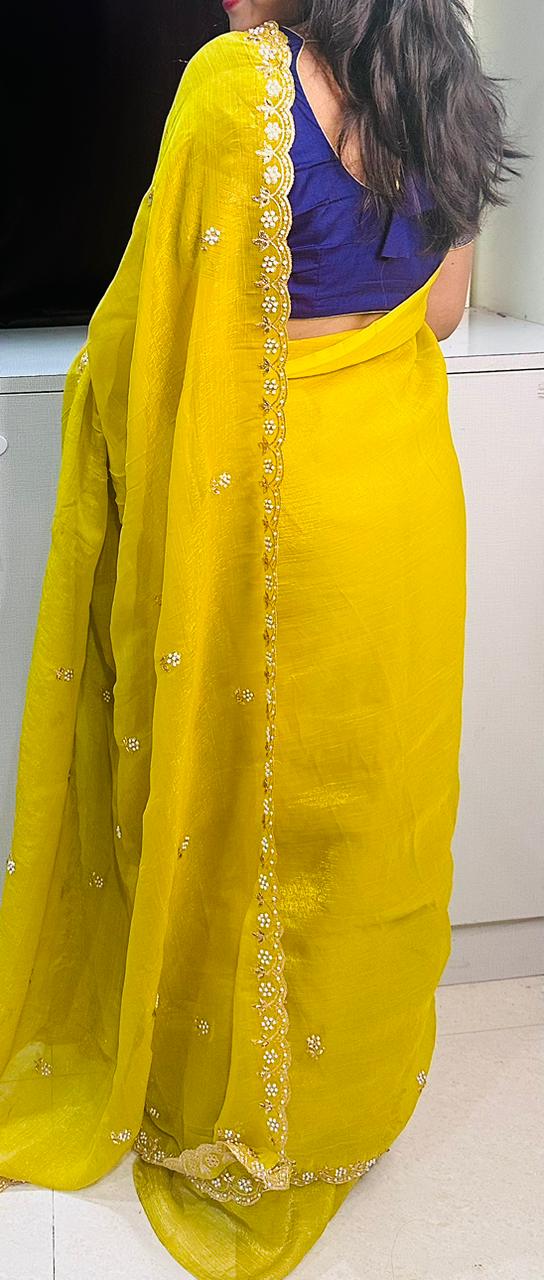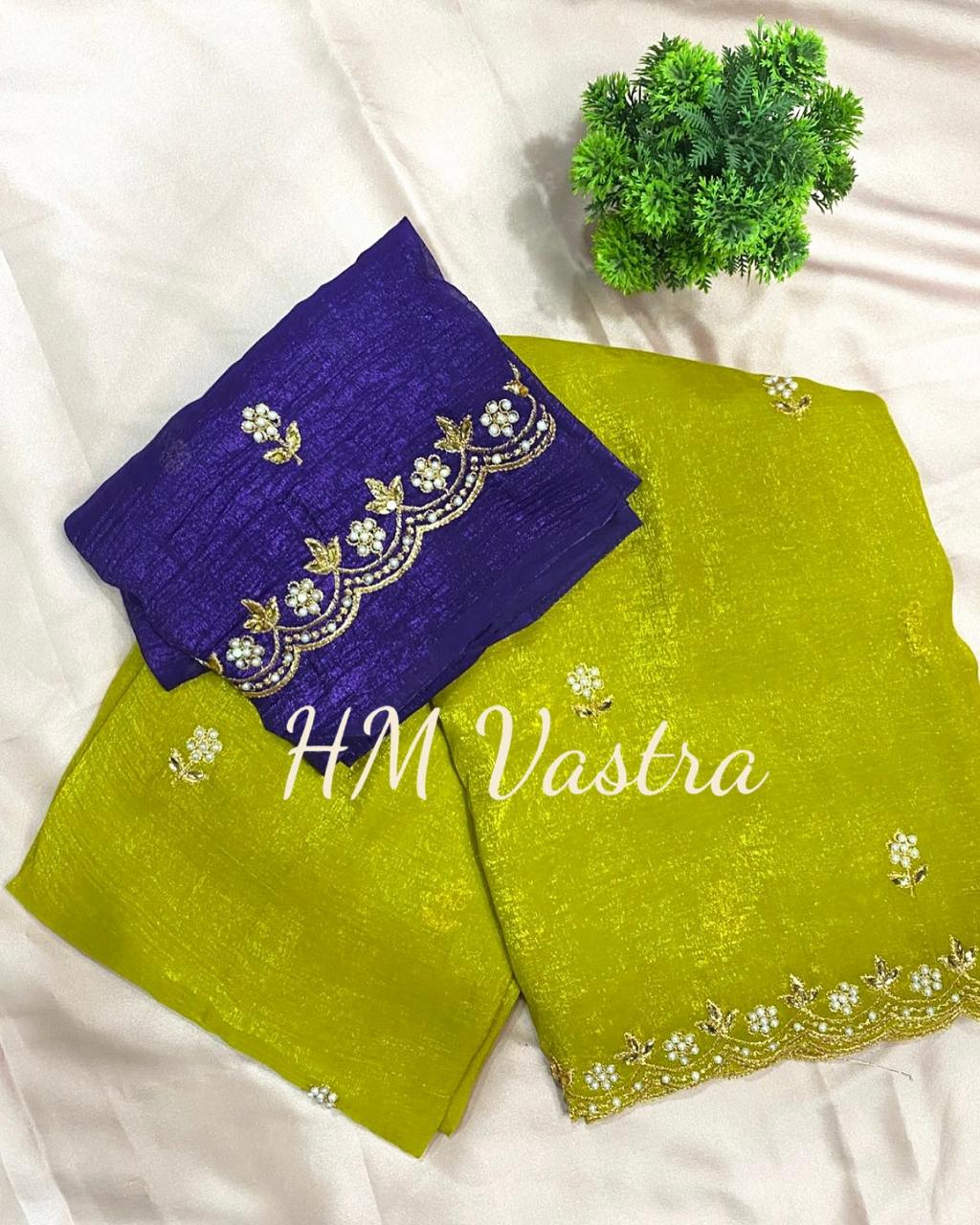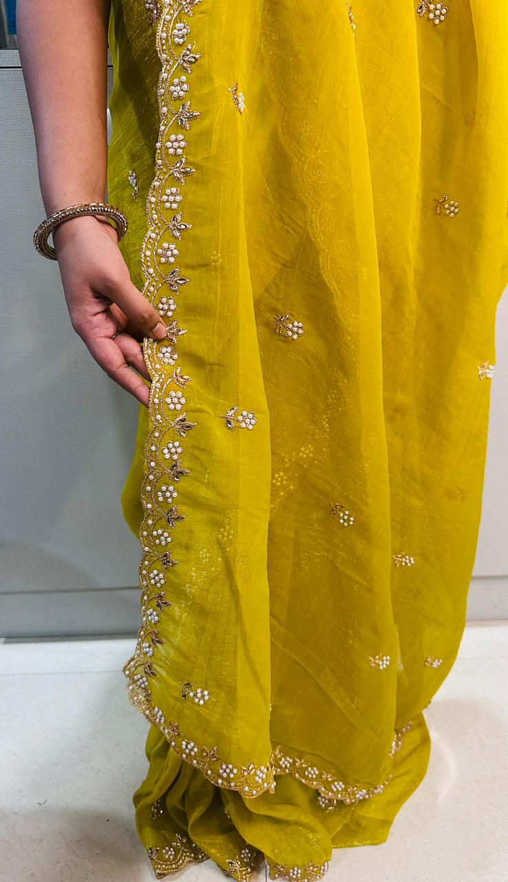 This meticulously crafted Jimmy Choo saree showcases exquisite cut work detailing throughout the fabric, creating a refined texture that exemplifies superior craftsmanship. The understated elegance and clean lines maintain a sophisticated simplicity, while the thoughtfully designed contrast blouse provides a striking visual complement. An exceptional choice for the discerning wearer who appreciates subtle luxury with technical precision.